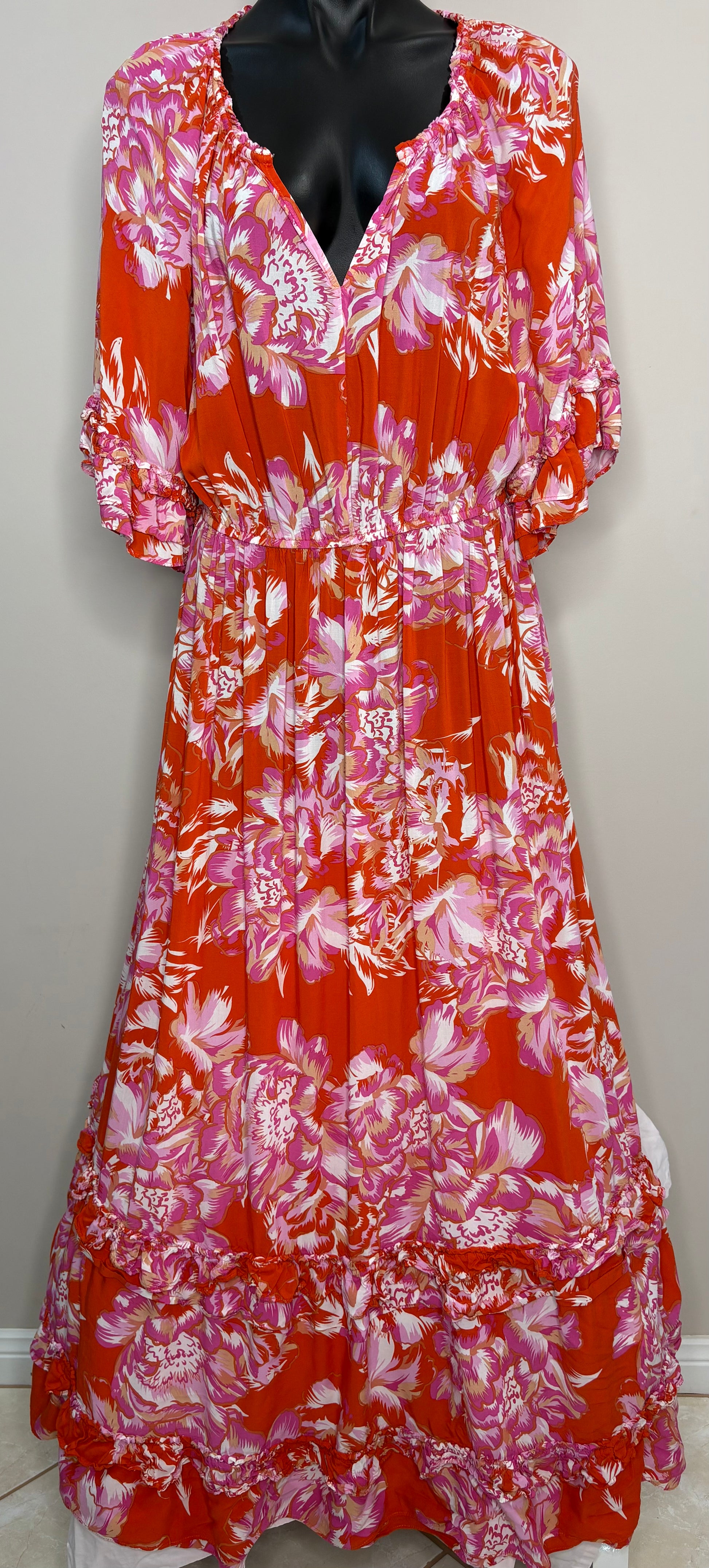 The gracefully layered silhouette creates dimension and movement, while the flowing maxi length offers refined sophistication for any occasion.