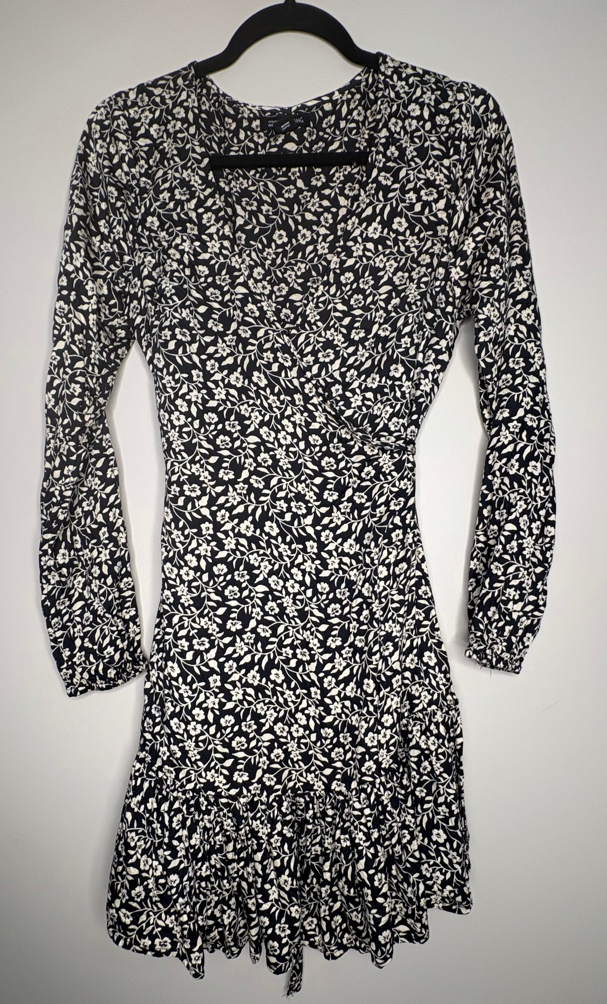 Its delicate floral pattern and wrap silhouette flatter a variety of figures, while the skater cut offers graceful movement.
