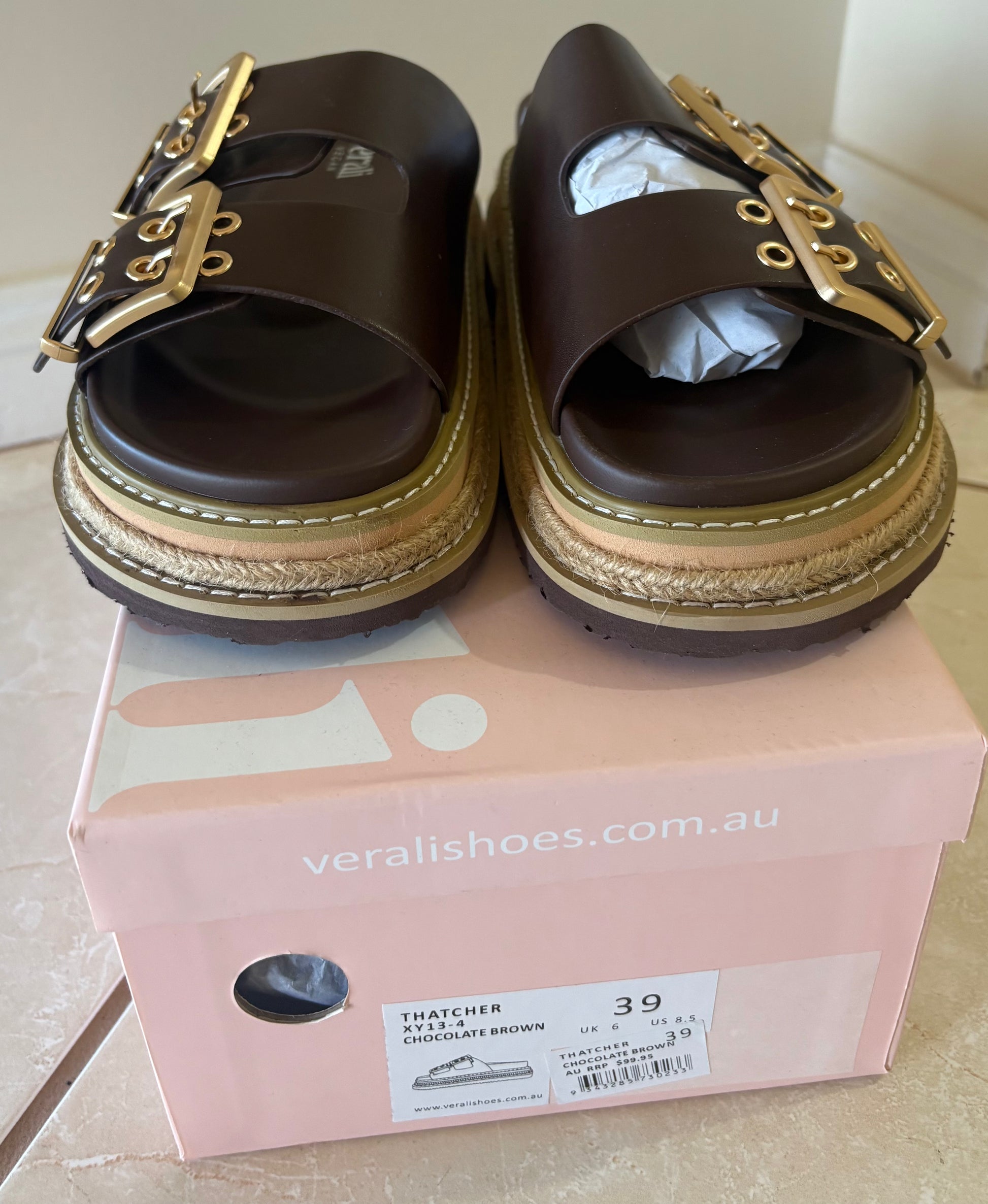 Step into timeless elegance with the 'Verali' Thatcher Chocolate Slides.